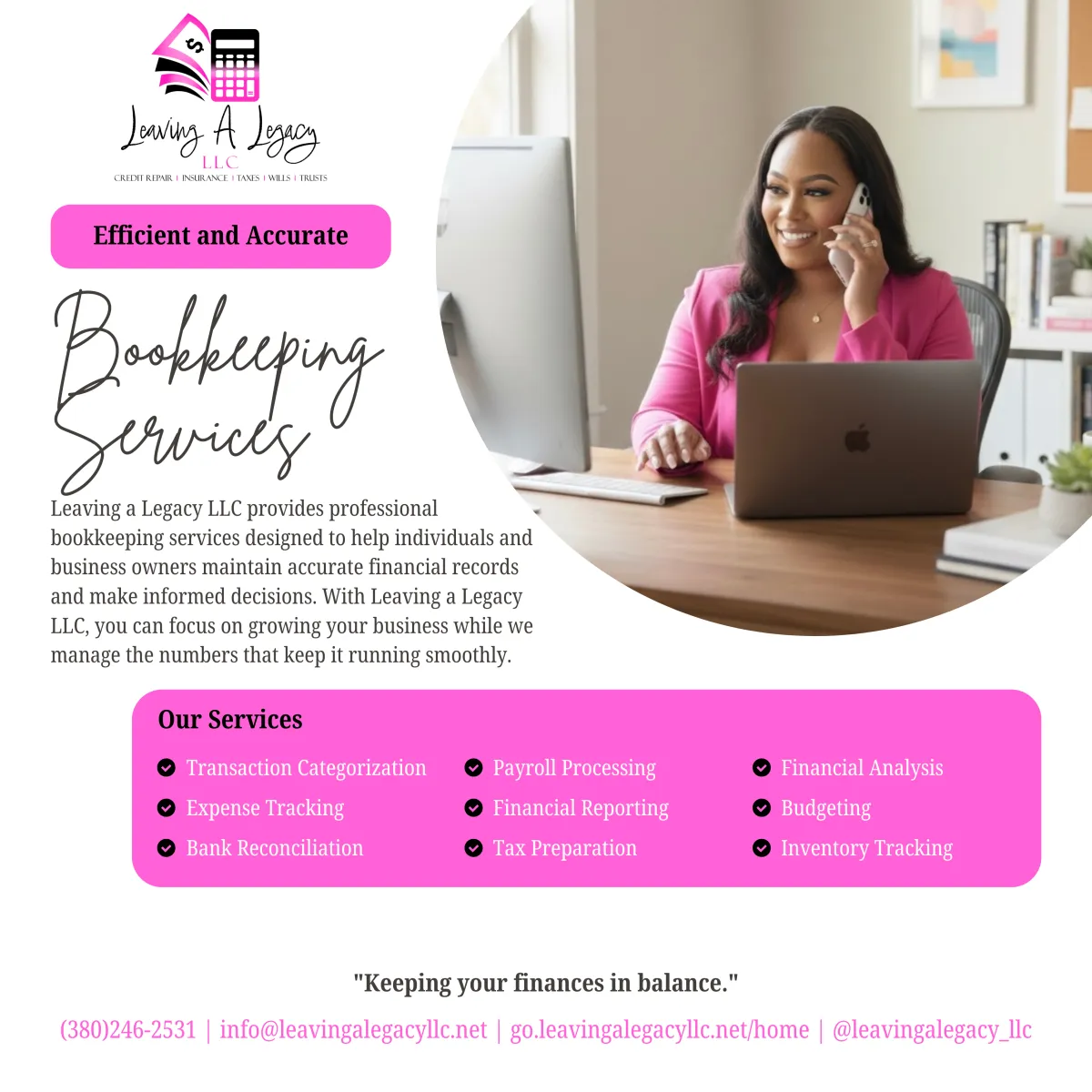 Leaving a Legacy LLC now offers professional bookkeeping services — designed to help you organize, track, and grow your business with confidence. Whether you’re running a startup, small business, or nonprofit, we simplify your financial management and provide the tools you need to stay on top of your numbers. Accurate records, expert guidance, and ongoing support that grows with your vision.
